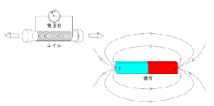 下図の様に、磁石にコイルを近づけたり遠ざけたりすると、コイルは磁石から発生する磁場の影響を受け、瞬間的に電気を発生します。この時発生する電気は、「誘導起電力」と言われるものです。磁場を持つ磁性体の近くをコイルが通過した際に、必ず生じる現象です。